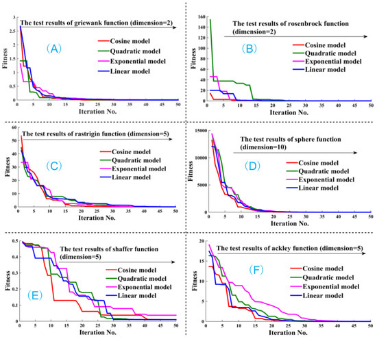 The comparison of convergence speed for four migration strategies in BBODE. In Figure 5, (A) four kinds of migration strategies (i.e., cosine model, quadratic model, exponential model, linear model) were tested by griewank function with the dimension 5. From the fitness curve in (A), quadratic model has the better convergence speed and accuracy. In (B), four kinds of migration strategies were tested by rosenbrock function with the dimension 2. From (B), considering convergence speed and accuracy, we can conclude that cosine model has a superior performance. Similarly, in (C–F), four kinds of migration strategies were tested by rastrigin function with the dimension 5, sphere function with the dimension 10, shaffer function with the dimension 5 and ackley function with the dimension 5, respectively. From (C–F), compared with quadratic, exponential, linear models, the convergence speed and accuracy of cosine model remarkably illustrate its excellent performance. Summarizing, cosine model is a superior migration strategy in BBODE algorithm.