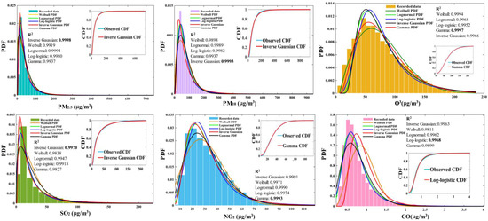 Statistical distribution functions were utilized to determine the basic characteristics of air pollutant concentration, from which we can penetrate into the uncertainty of air pollutants. Five distribution functions, namely Weibull, Gamma, Lognormal, Log-logistic and Inverse Gaussian were exploited to study the statistical properties of six air pollutants, which are PM2.5, PM10, O3, CO, NO2, SO2 respectively. The probabilistic distribution functions (PDF) and the cumulative distribution functions (CDF) of the aforementioned distributions are as shown in the Appendix A.