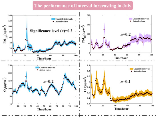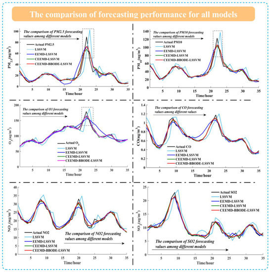 The LSSVM tool not only implements effective point forecasting, but also performs outstandingly in interval forecasting, which has capability to quantify the uncertainty for point forecasting. In this paper, the LSSVM toolbox in MATLAB provided by De et al. (http://www.esat.kuleuven.be/sista/lssvmlab/) was utilized to carry out interval forecasting for air pollutants. The construction of the forecasting intervals are based on the central limit theorem for linear smoothing combined with bias correction and variance estimation. Details of the code of LSSVM for interval forecasting can be obtained from the aforementioned website, and accordingly here we only a brief description on its steps: Step 1: utilize original data to train the LSSVM model based a RBF basis function. Step 2: calculate the smoother matrix for LSSVM. Step 3: compute the conditional basis and conditional variance. Step 4: set up the significance level. Step 5: obtain forecasting intervals for this fixed significance level. More details about interval forecasting using LSSVM can be found in [34].