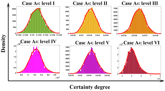To balance the latent uncertainty of subjectivity in the AHP method, a novel entropy-AHP method was proposed, which can be calculated via Equation (13). Then, the certainty degree U for a level of one criterion can be obtained using Equation (14):