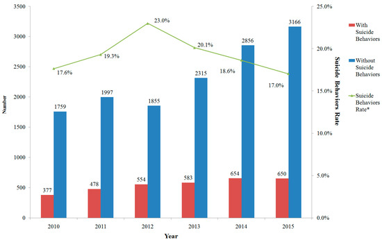 Numbers and suicidal behavior rates for inpatients with mental disorders in Beijing Anding Hospital, 2010–2015 (* χ2 = 39.6, p < 0.001; linear-by-linear association: χ2 = 4.4, p = 0.035).