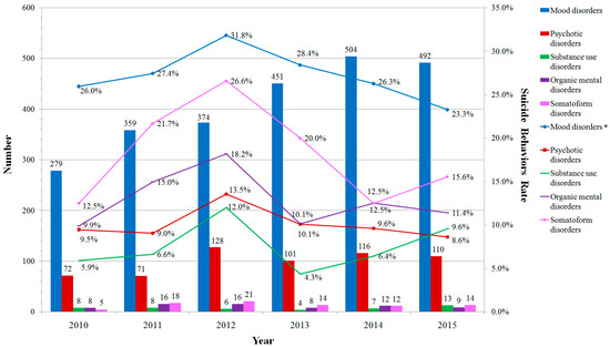 Numbers and suicidal behavior rates of inpatients with each category of mental disorders in Beijing Anding Hospital, 2010–2015 (* linear-by-linear association: χ2 = 8.4, p = 0.004).