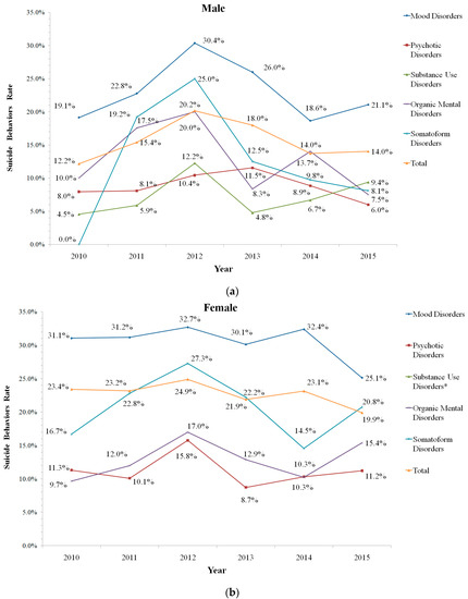 The suicidal behavior rates of (a) male and (b) female inpatients with mental disorders in Beijing Anding Hospital, 2010–2015. (* Substance Use Disorders was not shown because of the small numbers.).