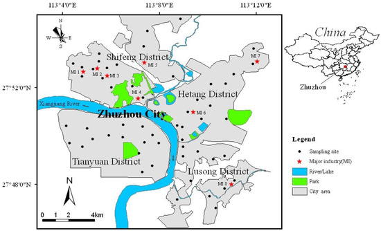 Sketch map showing the study area with sampling locations of street dust and the major industries in Zhuzhou city.