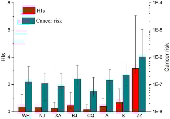 Since arsenic is outstanding both for cancer and non-cancer risk for many researches. Here we take arsenic as an example, compared the results obtained by this study and other researches. The HI and cancer risk of As for children are calculated according to the date from other literatures [33,36,37,38,39]. The HI means of these cities are less than 0.1 (Figure 2) and the cancer risk means are in 10−7 to 10−8 level (Figure 2). The maximum of HI in Wuhu (China) and Singapore are 9.29 × 10−1, 9.66 × 10−1, respectively, which are very close to one. While the data indicated that the HI and cancer risk of As in Zhuzhou are much serious than other cities (HI > 3, and cancer risk > 10−6), indicating a more worrying polluted status.