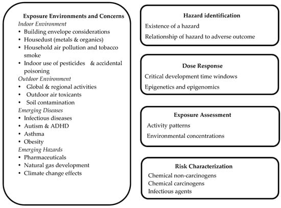 We have approached this review of children’s exposure to contaminants through the lens of the human risk assessment approach, and presented information from the literature on hazard assessment, dose-response, exposure assessment and risk characterization, with first a look at the exposure environment We also included additional thoughts on risk mitigation following risk characterization to address barriers to protecting children health beyond developing the scientific evidence. Research on children’s exposure to environmental contaminants often focuses in one area of the human risk assessment approach for a particular disease outcome or for a particular contaminant of interest. A variety of study designs are used, therefore, to address children’s exposures and health risks, and include prospective or retrospective epidemiological studies, and bio-monitoring or environmental and activity measurement studies, to name a few approaches. Each study has its benefits and limitations that most authors have articulated in order to better understand study results and implications for the field. The review also addressed some challenging and growing diseases of concern (e.g., autism, asthma) that likely have multiple determinants, offering opportunities for interdisciplinary research.