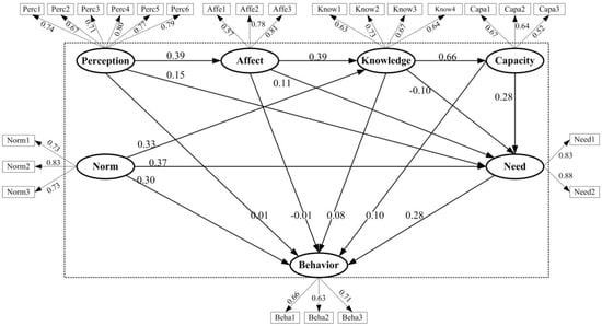 Using the maximum likelihood estimation, the CFA with a first-order and one-dimension was computed to measure the seven constructs. As shown in Table 2, inter-item correlations (construct loadings) were extremely significant in statistics (p < 0.001, all above the threshold value of 0.50 [49]), which indicated that the latent variables could be strongly explained by measured variables. The composite reliability values (CR) ranged from 0.61–0.93, greater than the critical limit (0.60) [50]. The average variance extracted (AVE) values were between 0.35–0.73. The AVE values of Knowledge (0.43) and Affect (0.47) were near the threshold value of 0.50 [51], but Behavior (0.35) and Capacity (0.37) were lower, suggesting that the average explanatory power of each item was insufficient to represent the latent constructs of both Behavior and Capacity; while the other latent constructs had good reliability.