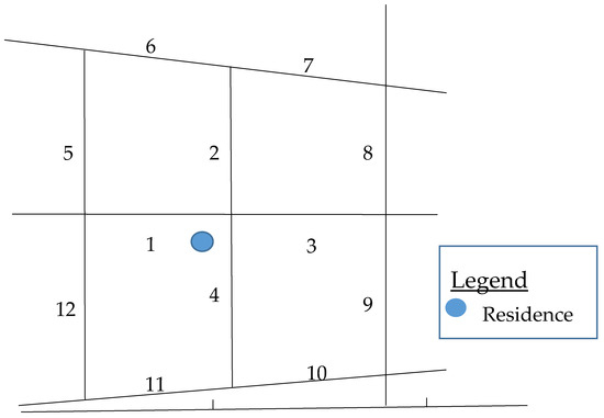 This is an example of a neighborhood segment map that would be created for each participant before virtual audits. The lines denote different streets, forming street intersections where lines intersect. The blue dot denotes a participant’s residence. The neighborhood around a specific address, or the proximal immediate neighborhood, is defined as the 12 closest street segments to a specific address. Street segment is consistent with established definitions of where one street intersects another.
