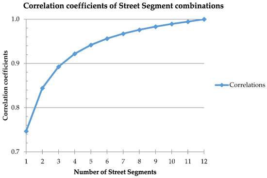 Correlation coefficients obtained from street segment combinations coding. Combination coefficients were generated by code developed in Statistical Analysis Software which runs a series of combinations of scores from one street segment up to twelve segments (i.e., 12C1, 12C2…12C12) per participant, simulating all possible ways in which a certain number of street segment scores can be randomly chosen from the overall 12 street segment scores, without any repeated segment combinations. The code calculated means for the selected combinations then averaged the means across all participants to obtain overall combination means (i.e., overall means for 12C1, 12C2…12C12). Spearman calculations used to determine associations between overall segment combination means (i.e., 12C1, 12C2…12C12) and participants’ segment means.