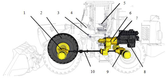 A wheel loader is an important type of earth-moving machinery that is mainly used to load materials in severe environments, such as mining and construction fields, etc. [16]. Its power transmission path is shown in Figure 1. The output torque of engine 8 is transmitted to the front axle 1 and the rear axle 9 through the hydraulic torque converter 7, the transmission assembly 6, and then through the transmission shaft 10. Finally, the power drives the wheel loader to work.
