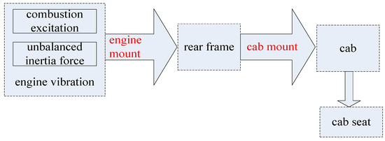 Engine vibration is caused by combustion excitation and the unbalanced inertia force of the engine. Its vibration is transmitted from the engine mount, rear frame, and cab mount, to the cab, finally causing the cab seat to vibrate. Its transmission path is shown in Figure 2.