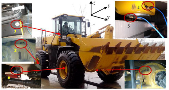 The vibration sources were identified by considering the relationship between the cab seat vibration and the rotating member excitation frequency employed in the test. Therefore, the three direction accelerometers are fixed in each key component, in order to measure the vibration acceleration at each measuring point. Figure 3 shows the test site. Five accelerometers (labeled 1–5, type 356A12) (PCB Piezotronics Inc., New York, NY, USA) were fixed to different components of the transmission system. A photoelectric sensor (labeled 6, type WL18-3P130F29) (Hydrotechnik GmbH, Limburg, Germany) was used to determine the rotational speed of the front-axle input shaft, and this was used as the tracking signal. In the figure, the x-, y-, and z-axis, represent the fore-and-aft, lateral direction, and vertical direction of the wheel loader, respectively. The data collection device (type Scada-05) and data analysis system (type CADA-X) were from LMS Company in Belgium.