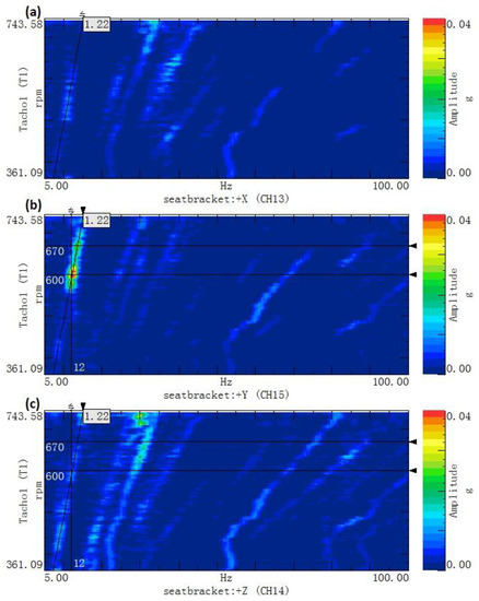 The order tracking colormap of the acceleration: (a) x direction; (b) y direction and (c) z direction.