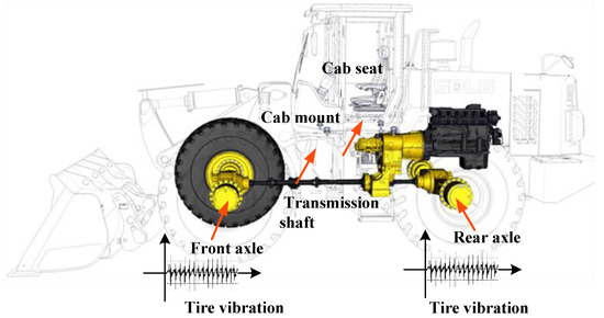 The vibration sources of the cab seat during walking are the engine vibration, tire/road vibration, and other vibrations associated with the machinery.