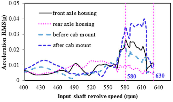 Figure 6 shows the 1.22 order vibration acceleration of the four transmission parts, with different rotational speeds in the y-direction. As can be seen in the figure, the results show a rotational speed (n) of between 580 and 630 rpm (approximately corresponding to tire vibration frequencies of between 11 and 13 Hz, as determined by Equation (1)). The vibration amplitude of the front axle is far higher than that of the rear axle, because it bears load in front of the loader. The vibration amplitude in front of the cab mount is equivalent to that of the front axle. However, it is obvious that the vibration amplitude behind the cab mount is considerable, indicating that the cab mount has an amplification effect on the vibration in the y-direction. Therefore, there is a need for further study, to optimize the structure of the cab mount.