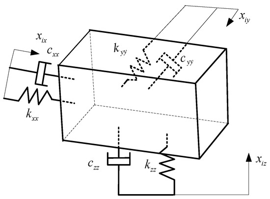 Let us assume that the vibration model of the cab mount is a dynamic system, as shown in Figure 7. The motion equations of the system were formulated as follows, based on Newton’s second law: