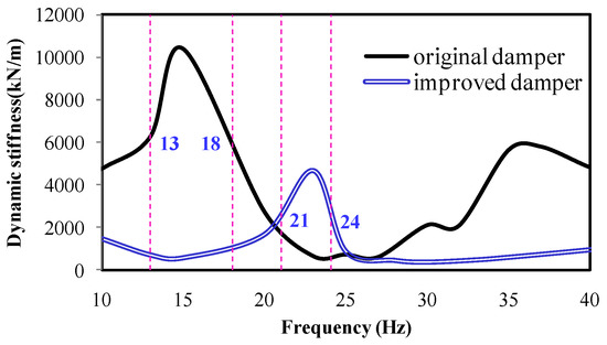 In this paper, a method of replacing the cab absorber is adopted for reducing the stiffness kyy of the cab mount system. Figure 9 compares the original and improved stiffness of the cab absorber. It can be seen from the figure that the original cab mount exhibited a higher elastic coefficient, within 11–13 Hz.