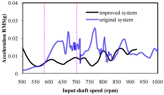 Figure 11 shows the y-direction acceleration amplitudes of the cab seats of the two different cab mount systems (improved system and original system), at an order of 1.22. The improved cab mount obviously decreased the vibration amplitude during rotational speeds of 580–630 rpm. The statistical results indicate that the average vibration amplitude was decreased by 50.8% in this rotational speed range.
