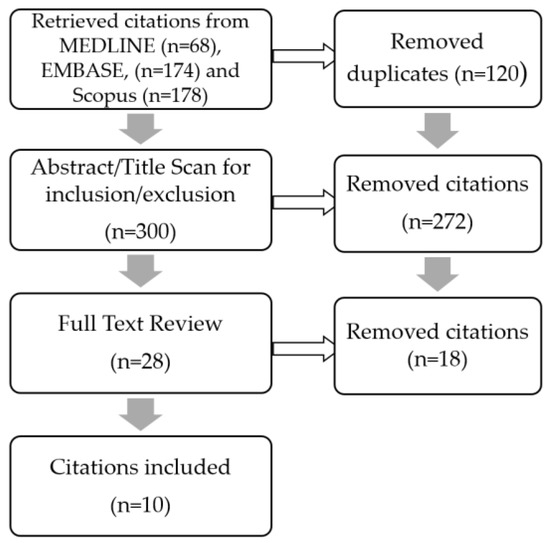 The selection process of the scoping review is outlined in Figure 1. We initially retrieved a total of 420 articles retrieved from MEDLINE (n = 68), EMBASE (n = 174) and Scopus (n = 178). Once duplicates were removed, the titles, abstracts and keywords of the remaining 300 articles were scanned by three reviewers for their relevance. Agreement among the reviewers of the initial scan was high (kappa = 0.93) across reviewer pairs on article selection for the review. We settled inconsistencies with a second round of scanning and consensus was achieved regarding relevance for the full-text review for all articles between all authors.