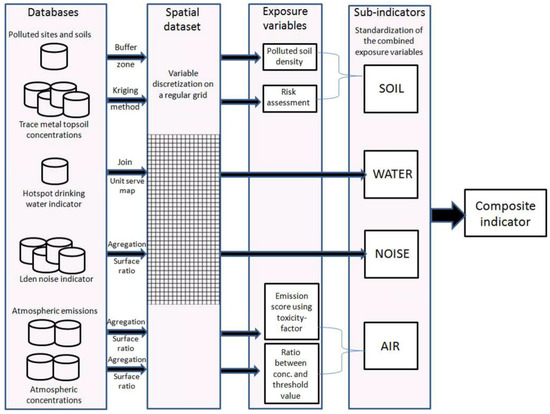 Humans are exposed daily to multiple chemical and non-chemical (e.g., biological, physical, or psychosocial) stressors. However, toxicological and epidemiological studies typically examine individual stressor-response relationships. Ideally, direct measures of exposure (e.g., biomarkers or personal monitoring data) would be available for all key stressors related to a common health effect throughout the critical time period of exposure and in the population of interest [1]. The exclusive use of biomarker data in cumulative exposure assessment efforts is currently not practicable when considering a large number of diverse chemicals due to analytical and resource limitations [2], especially when the assessment should cover a large territory. Environmental quality data are often available at a fine administrative or resolution level, and enable the building of environmental indicators on a regional scale. The definition of indicators for the identification and characterization of environmental inequalities depends on the reutilization of this type of data, which is very diverse by nature, with regard to its initial intended objectives. In France, this kind of data has already made it possible to highlight important regional disparities in the distribution of environmental quality [3,4]. To date, geographical information systems (GIS) technology has proven to be a powerful tool for dealing with various types of environmental data. Some studies integrate georeferenced measure monitoring or modeling data to estimate the exposure dose, and may include studies on various single environmental media, such as soil [5], water [6], and air [7,8], or a multimedia approach [9]. There will be cases where risk cannot be quantified in any meaningful or reliable way due to lack of representative data or missing source contributions. In order to reduce the spatial data representativeness problem (based on the lack of available data) and characterize associated uncertainty, more sophisticated methods of spatial analysis have been developed [10,11]. Qualitative approaches could also be used to overcome the complexity and data deficiencies that hinder quantitative approaches. Broad indicators using geographically based measures of exposure are used as an indicator of cumulative exposures from all of the potential chemicals associated with that site.