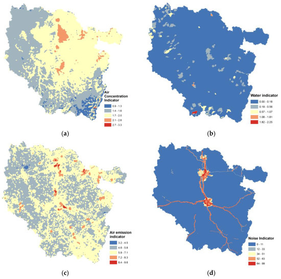 In France, environmental health inequalities are understood as the unequal geographic distribution of multiple exposure. No statewide data are available that provide direct information on exposures. Exposures generally involve transfer of chemicals from a source through the environment (air, water, soil, food) to an individual or population. For the purposes of the study, data relating to pollutant sources, releases, and environmental concentrations are used to build indicators of potential human exposures to pollutant. Pollution burden indicators should relate to issues that may be potentially actionable by stakeholders. Based on the regional context and data availability, four dimensions were identified and found consistent with criteria for exposure composite indicator development: water, air, soil, and noise. Then, four subindicators should provide a measure that is relevant to the dimension it represents in the context of the study objectives. The subindicators used should also represent widespread concerns related to pollution in Lorraine and provide a good representation of each component.