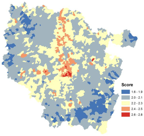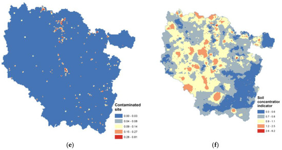 The air concentration indicator variations are weak throughout the studied area due to the background exposure concentration (Figure 2a). The area with the most elevated values corresponds to urban agglomerations. For drinking water, the map presents several hotpots corresponding to one or a combination of different pollutant concentrations above defined thresholds (Figure 2b). For example, the most elevated area of concentration (2.25) corresponds to natural arsenic and fluoride exceedances averaged during the four-year period of the study. The atmospheric emission indicator (Figure 2c) presents a similar pattern to that of the air concentration, but it also integrates district-level data in the higher-value district where an industrial site is located. The most elevated value (9.5) corresponds to polycyclic aromatic hydrocarbon and benzene emissions from steel industry activity. The noise map (Figure 2d) presents no value (as 0) for 90% of the studied area. Existent values are located on the region’s principal roads, based on available modeled noise levels. Principal contaminated sites and soil are located around a north-south axis called the Lorrain furrow (Figure 2e). The soil concentration indicator map presents two areas in which the value is greater than four (Figure 2f). These correspond to well-known contaminated sites. The largest value corresponds to a topsoil contamination of Hg, Cd, Cu and Zn, and the other to elevated concentrations of Cd in the topsoil. Specific spatial patterns are influenced by data spatialization methods and exposure variable transformation. Spatial resolution could also have an impact on individual area indicator values. In contrast to water risk factor indicators, where spatialization corresponds to a surface ratio of the initial spatial layer, the distribution of the emission indicators depends on the size of the geographic support aggregation.
