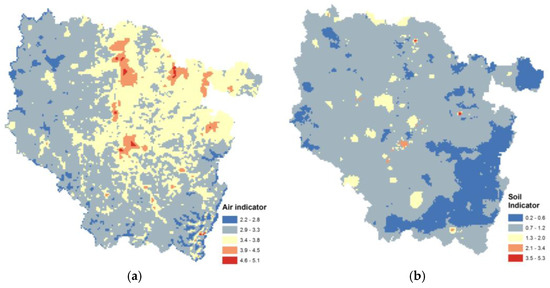 Maps of combined exposure variables for (a) air and (b) soil.