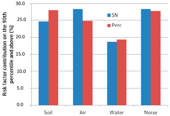 Figure 5 shows subindicator contributions above the 90th percentile for the composite indicators estimated using the two transformation methods. The noise and water risk factor contributions are quite similar. The variation of soil and air risk factors may be explained by the slope curve impact on the resulting composite indicator. Air and soil curves have similar forms for the percentile rank method (see Appendix A, Figure A1b,d), in contrast to the normal transformation for which the slope on the maxima range is more flattened for the soil than for the air risk factor (see Appendix A, Figure A1a,c). This results in a stronger contribution of the air risk factor in the composite indicator based on normal transformation compared to uniform transformation.