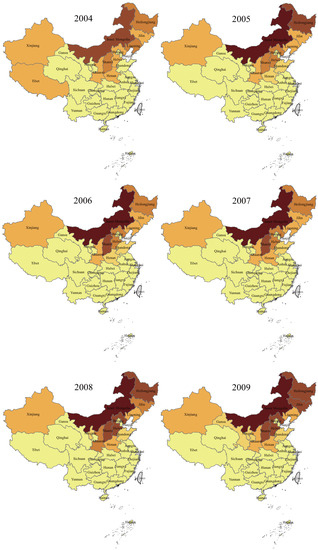 Spatiotemporal distribution of annual human brucellosis cases, by province, in China, 2004–2014.