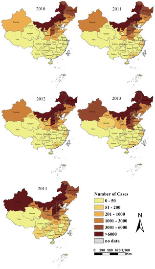 The re-emergence of brucellosis in recent years represents one of the major public health threats in mainland China. Since the beginning of the 21st century, the number of human brucellosis cases has dramatically increased throughout China and the number of human cases has reached a historic high with 57,222 cases reported in 2014. In the period 2004–2014, the human brucellosis epidemic was largely confined to the northern provinces (mainly including Inner Mongolia, Shanxi, Heilongjiang, Hebei, Xinjiang, Jilin, Henan, Liaoning, Shaanxi, Shandong and Ningxia; see Figure 1) where animal husbandry is commonly practiced, and thus the risk of infection is higher. Epidemiological reports on human brucellosis have previously been associated with animal habitat, occupation, host density, socioeconomic status, travel and immigration [39,40,41,42,43]. Although many measures based on the control programs for brucellosis have been set up, the brucellosis-positive rate in animals has increased significantly, along with an increase in human brucellosis cases in recent years. Increase in animal feeding, lack of immunization and animal quarantine, and frequent trading have been implicated as the key risk factors for the dramatic increase in brucellosis incidence in the past decade [19].