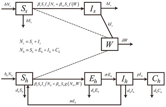 Brucellosis can be transmitted to individuals through direct contact with infected animals or indirect transmission by Brucella in the environment, which contains contaminated forage, water, grass, liquids, products and the uterine fluids from infected animals [26]. Environment-to-individual transmission is defined as a indirect transmission process with a high infectious dose, resulting from contact with Brucella in the environment. In contrast, individual-to-individual transmission is assumed to be a direct transmission process, with a lower infectious dose. In mainland China, B. melitensis (sheep-type Brucella) is the predominant pathogen associated with large outbreaks [31]. The result of Li et al. [20] also indicated that sheep and goats probably were the main animal hosts transmitting the diseases to humans in northern, northeastern and western China. Hence, sheep and goats were considered and called sheep population in the model. There are some assumptions for our model: (1) Brucellosis in the exposure period is hardly detected, and animals in this period can also infect susceptible sheep and humans. Hence, we ignored the exposed period in the sheep population; (2) In China in the 20th century, the control measure for brucellosis was mainly vaccinating livestock [31], but there are few reports on animal vaccination in the first fifteen years of 21st century. Therefore, animal vaccination is also ignored; (3) There is no data reporting human-to-human transmission of brucellosis, so the rate of human-to-human and human-to-animal transmission was ignored. There are also some other assumptions on our model, which are demonstrated in the flowchart (see Figure 2).