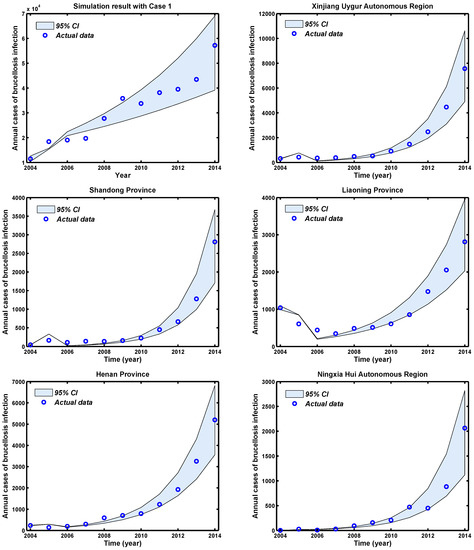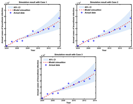 Figure 3 shows the comparison between theoretical and annual cases of human brucellosis infections in mainland China are plotted along with the 95% percent interval for 1000 simulation outputs from the alternative models Cases 1–3. From Figure 3, we can conclude that in three cases, there is no obvious difference in the simulation results. In order to check the adequacy of the model, we use the method of Akaike information criterion (AIC) [36,37,38], to compare the validity of the three results and choose the best model from multiple competing models. Since the ratio of the number of data points to the number of parameters fitted is less than 40, we need to compute the for each model. values corresponding to three Cases are , , , and the model with the lowest is Case 1. Moreover, Δ and Δ , which imply that assumptions Case 2 and Case 3 are considered as the model with less support. In a word, the model selection results show that Case 1, the standard incidence function, is consistently the best model to be used for inference.
