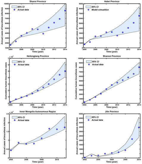 The provinces with the highest risk of brucellosis incidence in the country are very distinct in many ways, for example with respect to animal habitat and animal and human population densities. The process was initially conducted for mainland China (total) and then repeated for each of the 11 provinces with high case numbers. Through using the available parameters in Tables S1 and S2 (Supplementary Materials), and the estimated parameters in Table S3 (Supplementary Materials), Monte Carlo simulation runs were then conducted to assess the data fitting of the cases of brucellosis infection with mainland China and 11 provinces with high case numbers, and the plots are shown in Figure 4. The 95% percent interval for all 1000 passing simulation trajectories show that there is a good match between the reported data and the theoretical prediction of Equation (2).