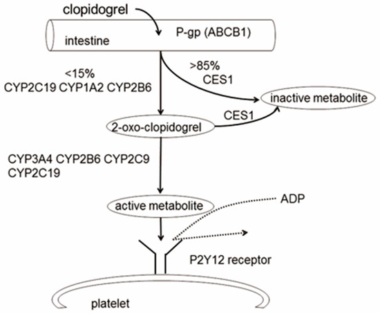 Polymorphisms in genes responsible for the drug efflux (ABCB1), metabolic activation or inactivation (CES1, CYP2C19, CYP3A4/5), and biological activity (P2RY12, PEAR1) of clopidogrel may account for a part of the interindividual variability in clopidogrel response (Figure 1, Table 1).