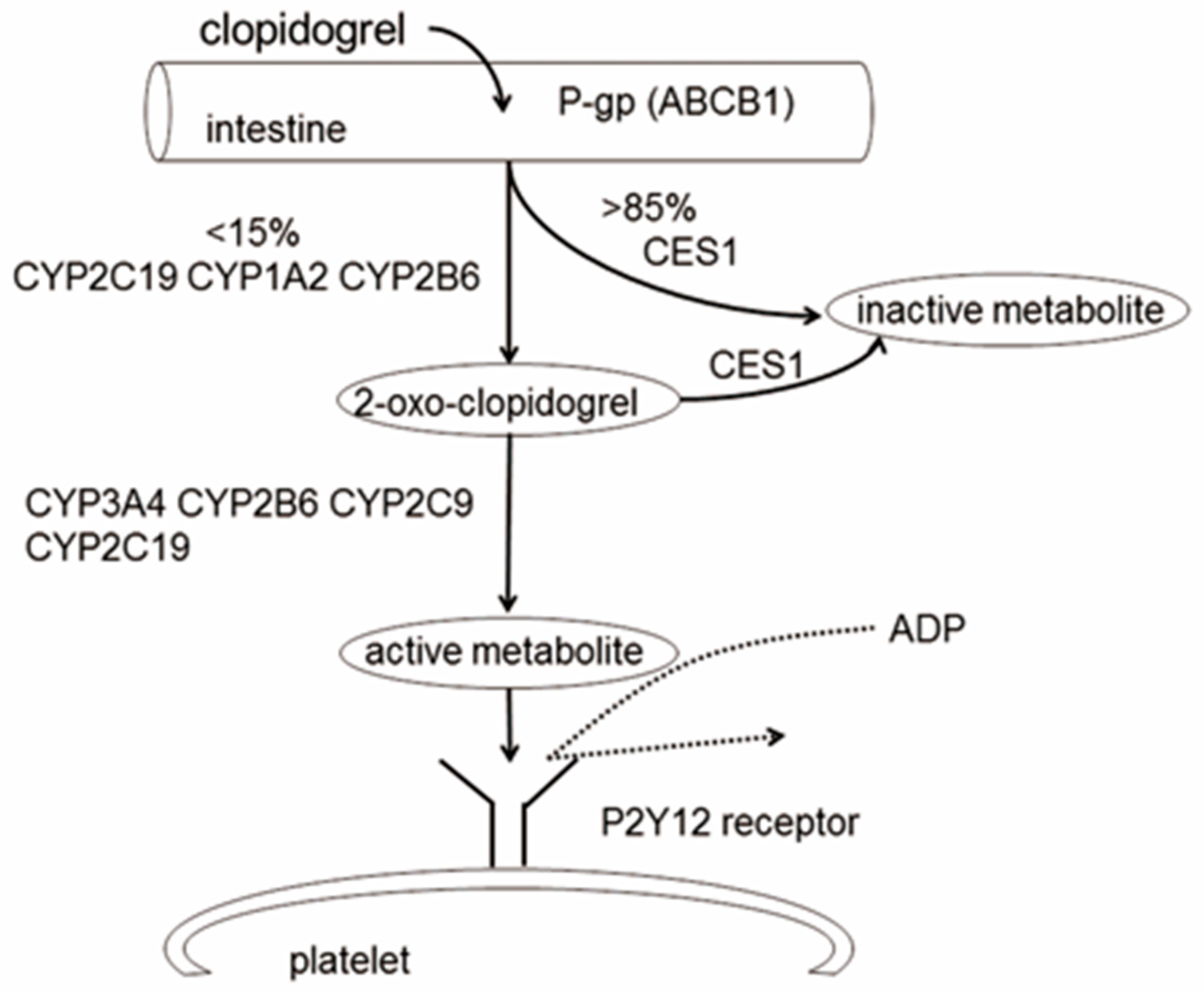 Carboxylesterase (CES) is the most predominant hydrolytic enzyme in the human body. CES catalyzes the hydrolysis of numerous ester- and amide-containing endogenous compounds, toxins, and medications to their respective free acids. The vast majority of absorbed clopidogrel is shunted by CES1 to inactive carboxylic metabolites [41]. Therefore, genetic variations affecting CES1 expression or its activity are supposed to be important determinants of clopidogrel response. CES1 has two isotypes, CES1A1 (often called CES1) and CES1P1. Previous studies have identified several single nucleotide polymorphisms (SNPs) in the coding region of CES1, including rs71647871 (G143E), rs71647872 (D260fs), and the intronic variant rs8192950 [13,42]. There is a study showing that the rs8192950 polymorphism is associated with a decreased risk of clinical events in clopidogrel treated patients with extracranial or intracranial stenosis [13]. The frameshift mutation rs71647872 is extremely rare. The G143E results in the non-conservative amino acid substitution of Glycine 143 to Glutamic acid, which decreases CES1 catalytic activity [42]. Lewis et al. found that carriers of the CES1 143E allele have higher levels of the clopidogrel active metabolite and better clopidogrel response than the 143G allele (wild-type) in healthy people [14]. Meanwhile, in patients with coronary heart disease treated with clopidogrel, the lower ADP-induced platelet aggregation and lower risk of cardiovascular events were found in 143E allele carriers. Tarkiainen et al. also reported in healthy volunteers that CES1 143E carriers have a larger AUC of clopidogrel and the active metabolite and lower P2Y12-mediated platelet aggregation [15]. In addition, CES1P1 rs3785161 was found to be associated with attenuated antiplatelet effect of clopidogrel in 162 coronary heart disease patients [16].