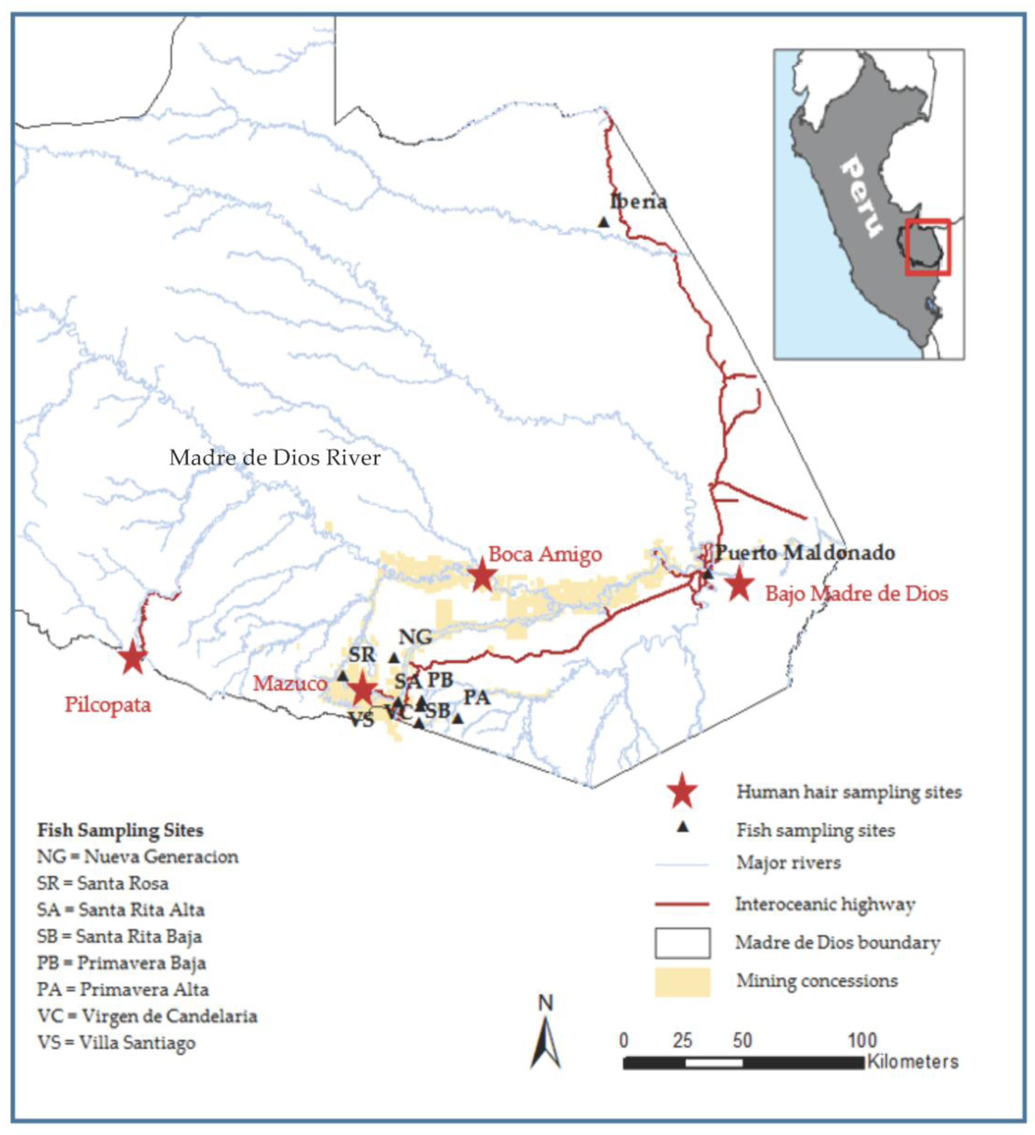 - Ashe, K. Elevated mercury concentrations in humans of madre de dios, Peru. PLoS ONE 2012, 7, e33305. [Google Scholar] [CrossRef] [PubMed]