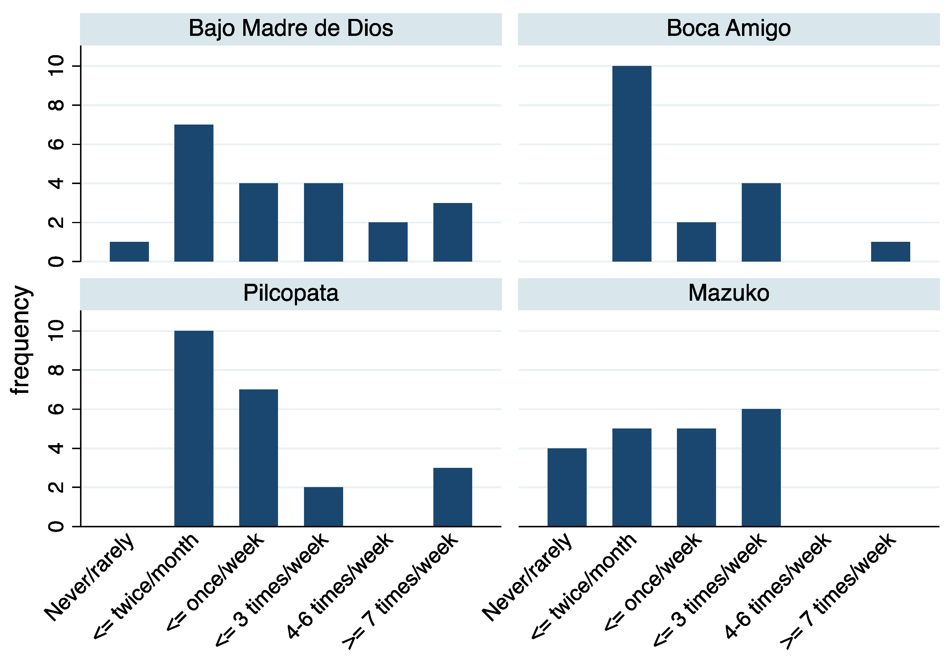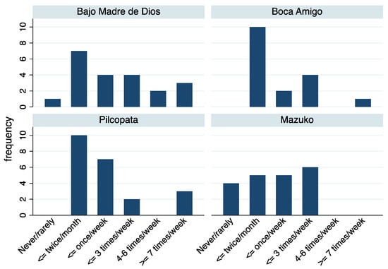 Figure 2 shows the distribution of the reported frequency of fish consumption by study site. Boca Amigo and Pilcopata had the greatest fraction of participants reporting an infrequent (i.e., two times per month or less) consumption of fish, while Bajo Madre de Dios and Pilcopata had the greatest fraction of participants reporting very frequent consumption (i.e., greater than or equal to seven times per week).