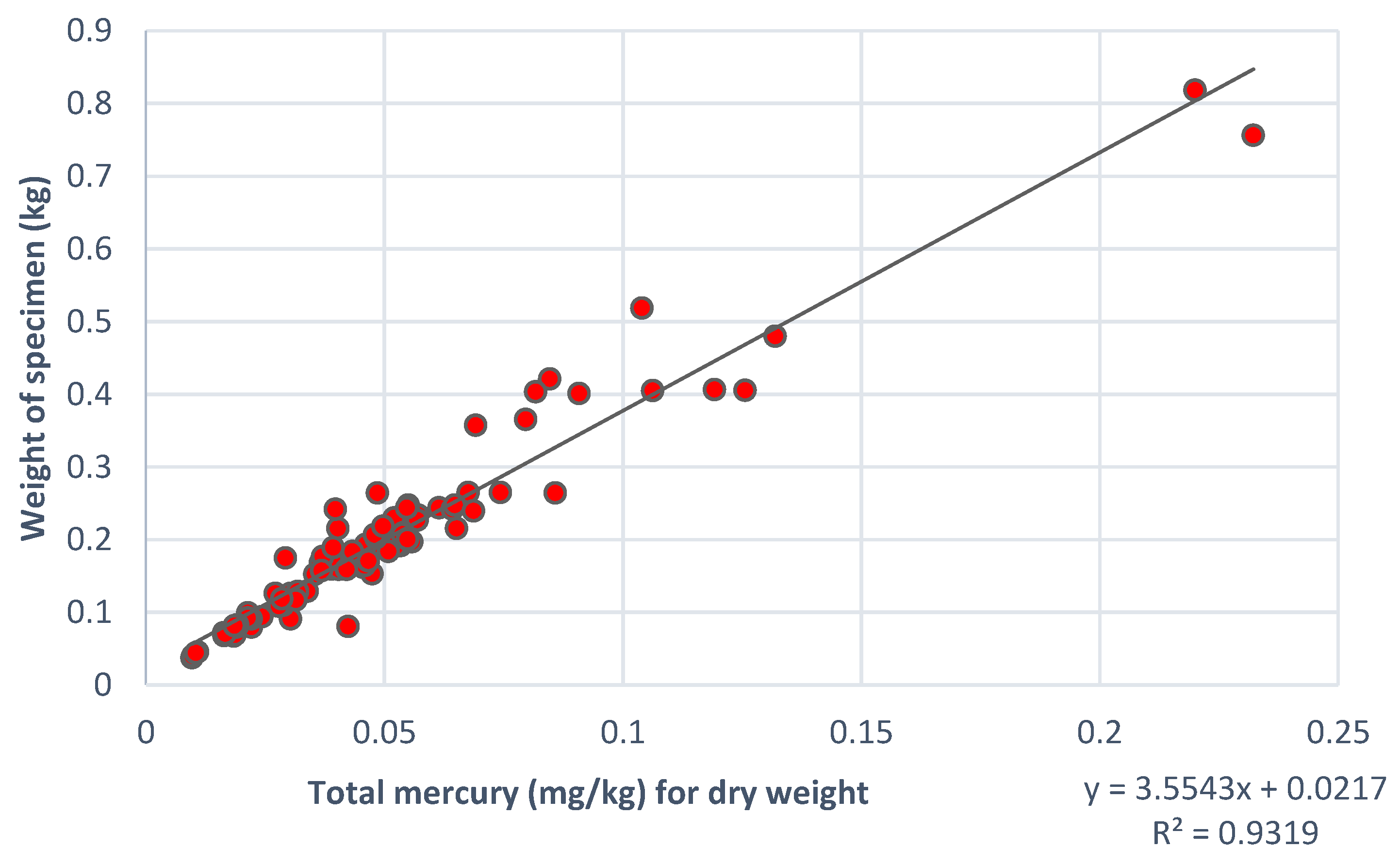 The weight of the fish specimen was positively correlated with mercury (mg Hg/kg dry fish tissue) (Figure 3). The R2 value of the relationship between fish specimen weight in kg and total mercury concentration in dry fish tissue, was 0.932. The fish sampled were between approximately four and eight months old at the time of sacrifice (i.e., fingerling transplant to aquaculture pond plus four to eight months of growth).