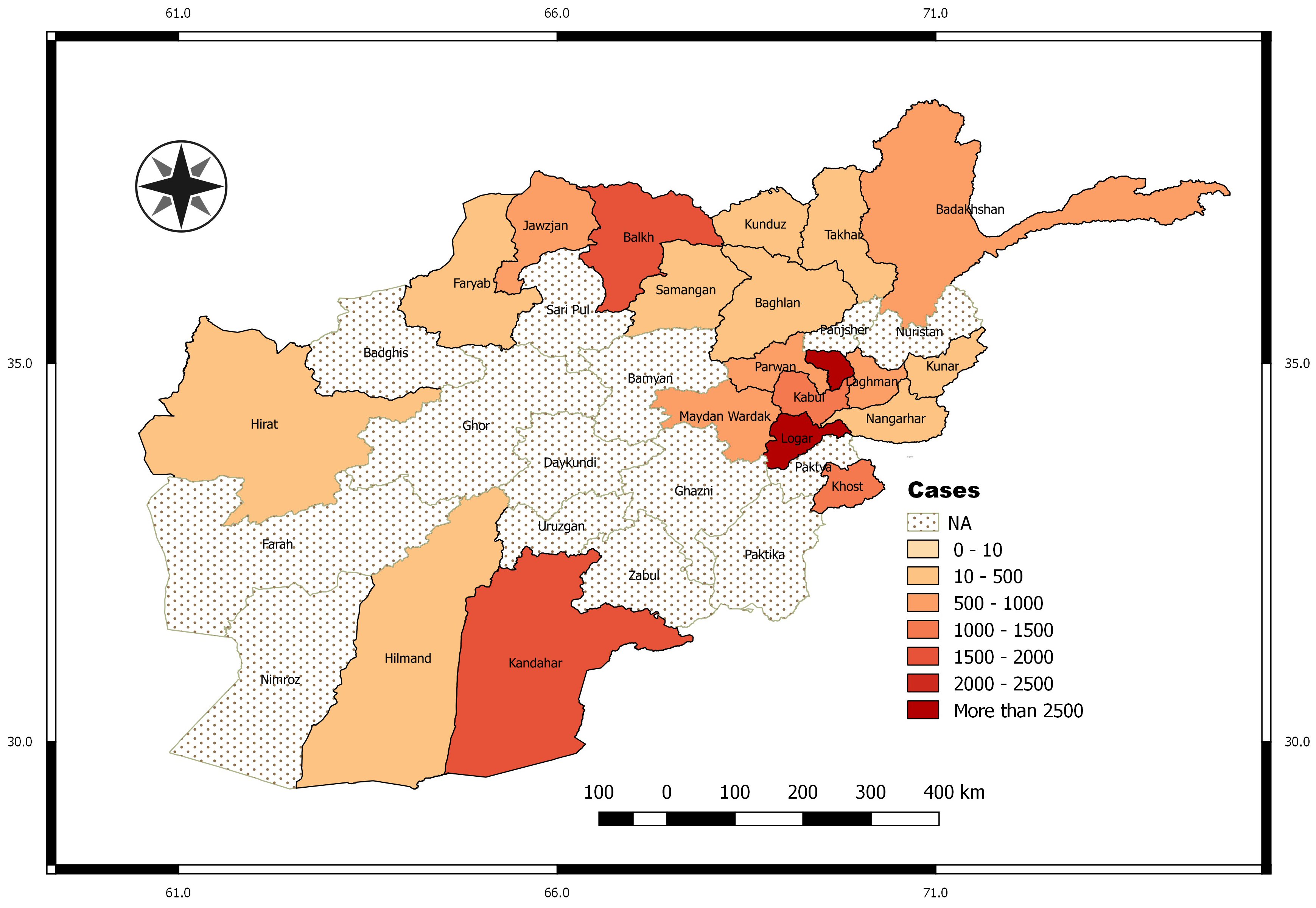 Similarly, the map in Figure 1 indicates higher disease incidence around the Kabul area (northeastern). Kabul City accounted for more than 50% of the total new cases in 2009, and this may be attributed to availability of health care facilities, which is crucial for data gathering in public health studies. The rate of infections is about the same for both male and female (around 50% each), while those in age group 4–14 years are more likely to be infected than other ages.