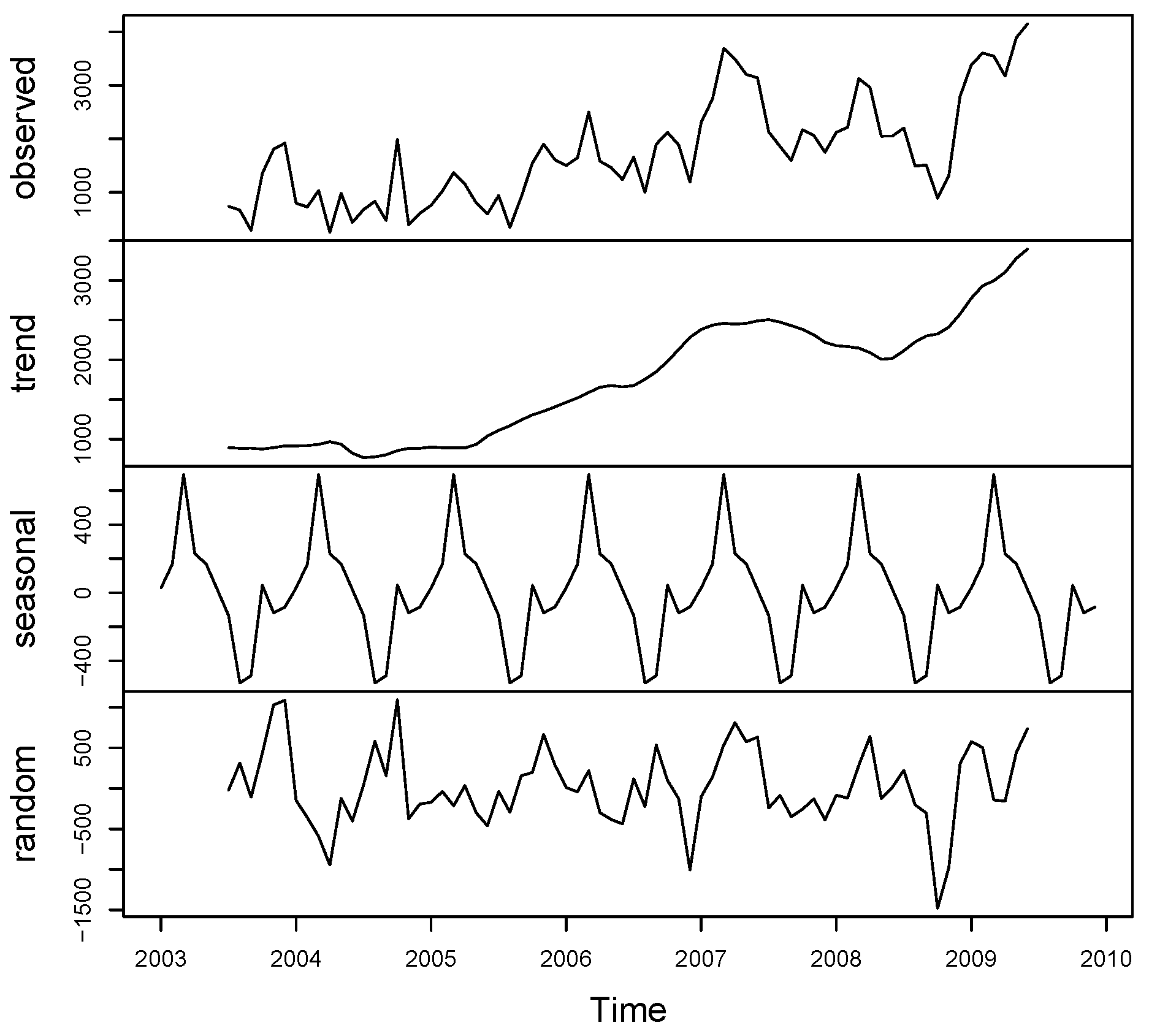 We begin the analysis by exploring the observed monthly cases of leishmaniasis in Afghanistan between 2003 and 2009. The top panel of Figure 2 shows the distribution of the monthly cases of the disease and a map of the aggregated monthly data across the seven years under study. The second panel is the trend component, which indicates a steady increase from 2003 to 2007, a small decrease in 2008, and then another increase in 2009. The third panel shows that the seasonal factor is the same for each year. An upward trend and regularly repeating patterns of highs and lows was observed related to the months of the year, which suggests seasonality in the data. The monthly profile indicates two peaks in the disease occurrence in Afghanistan between 2003 and 2009—January to March and September to December—which coincides with the cold period, while July is the hottest month and March is the wettest month. The largest seasonal factor is for March, and the smallest is for September, suggesting a peak in the cases of leishmaniasis in March and a trough in September of each year.