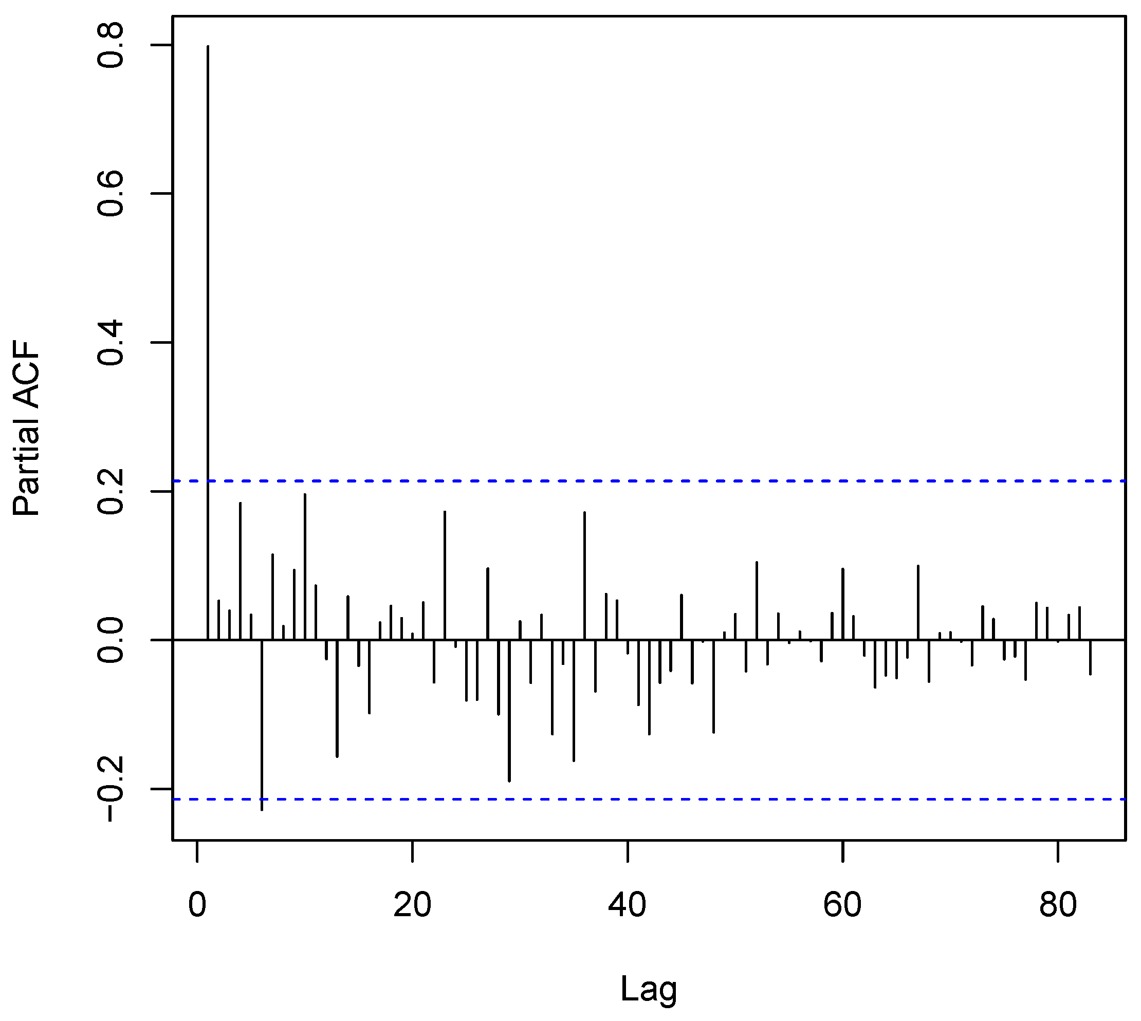 The autocorrelation plot (Figure 3) shows a significant autocorrelation at lag 1 with (D − W = 0.3719, p-value = 0). A further look using the partial autocorrelation function (PACF) shows a significant spike only at lag 1, which attests to the ACF. The autocorrelation at lag 1 is sufficient to explain the higher order autocorrelations, which implies that we can discard the longer lags.
