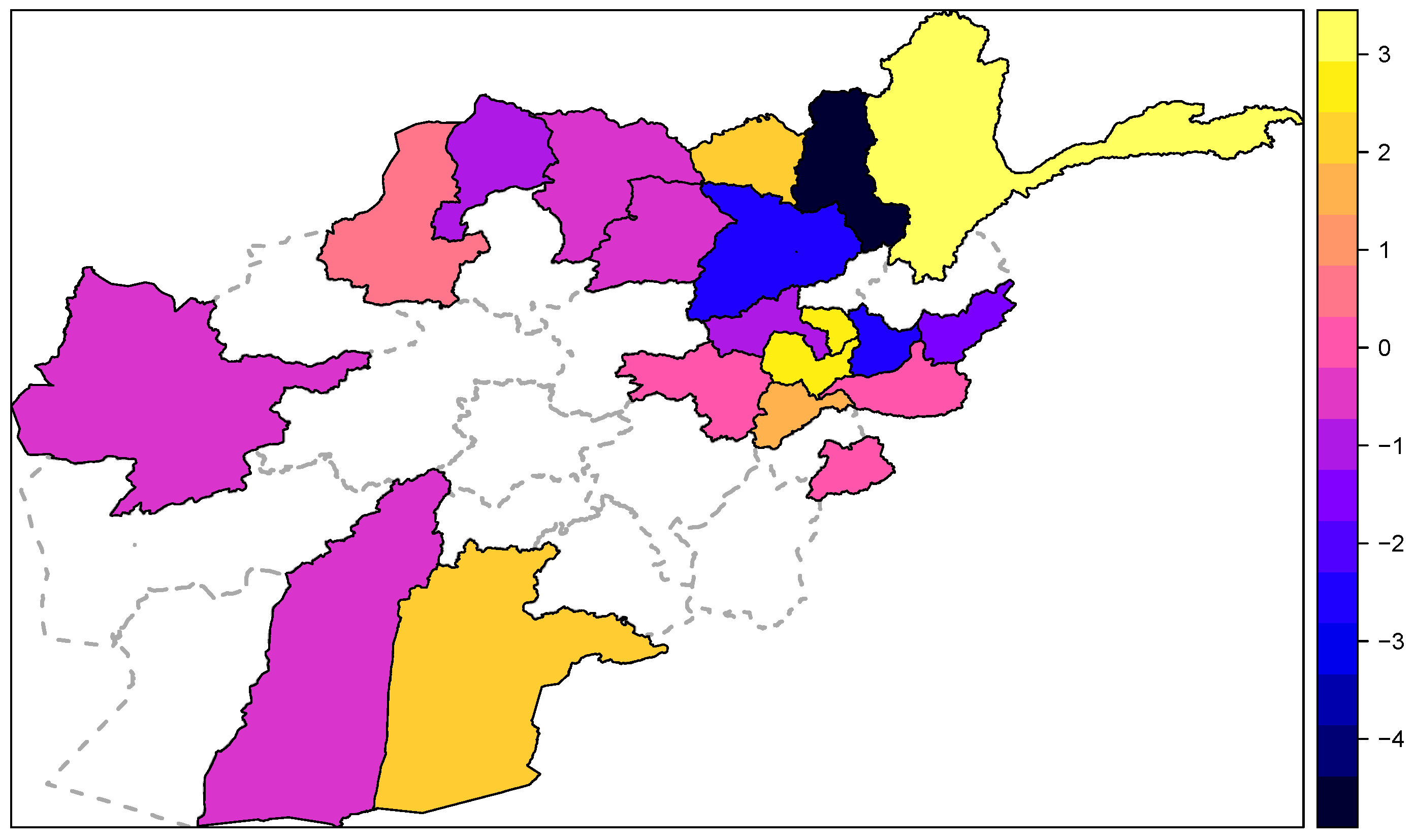The predictive capabilities of the models were assessed through one-step-ahead predictions of the last five months. Model M3 was chosen as the best model based on smaller RPS and LogS among the three models. The interpretation of the parameter values are on the log scale, for example, in M3 = exp(Trend) = 1.063 represents the seasonality-adjusted factor by which the basic endemic incidence increases per month. The estimates for trend and the seasonal components in the three models are quite similar and significant overdispersion parameter. The map in Figure 4 displays estimated spatially correlated random effects. It revealed that three provinces—Takhar, Baghlan and Laghman—show a low endemic incidence of CL in Afghanistan using variables from Model M3. The results of the best model confirmed the significant effect of precipitation and temperature. Likewise, the trend and the sinusoidal wave of frequency exerted a significant effect on leishmaniasis. However, no significant relationship of wind was detected as shown in Table 1.