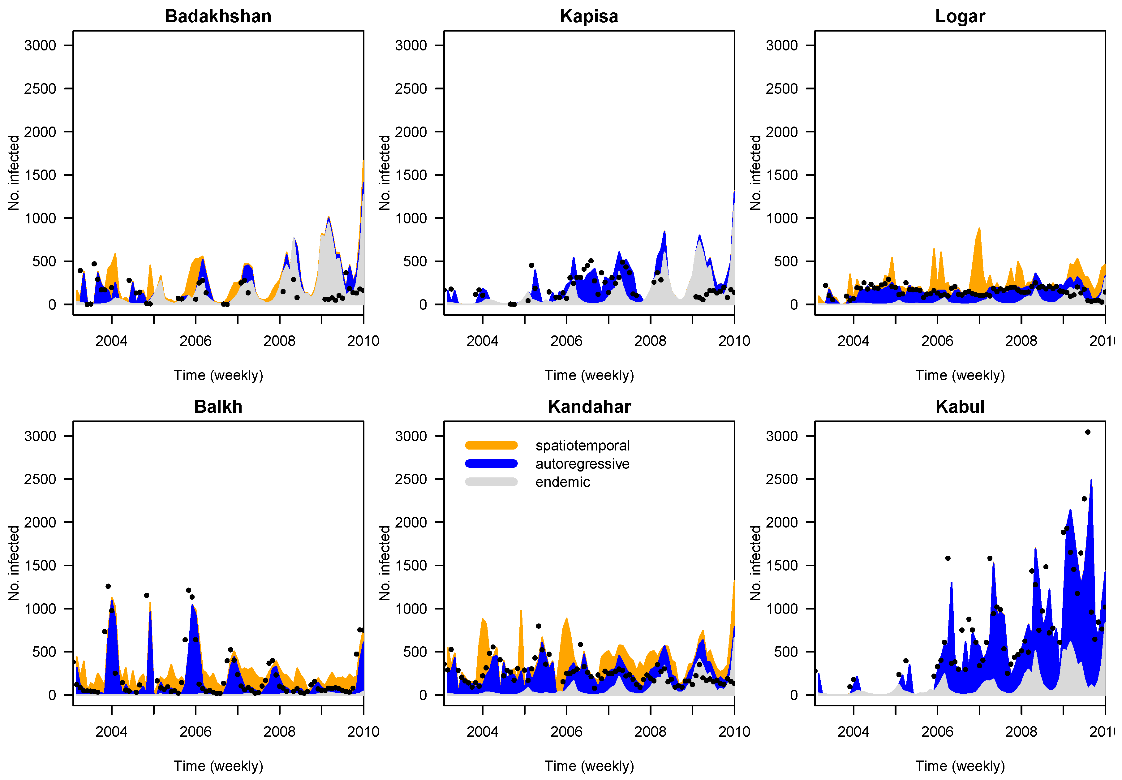 The fitted values for six provinces with the highest Leishmaniasis incidence in Afghanistan from Model 3 were presented in Figure 5. The plot is split into three components: the spatiotemporal, the autoregressive and the endemic components.