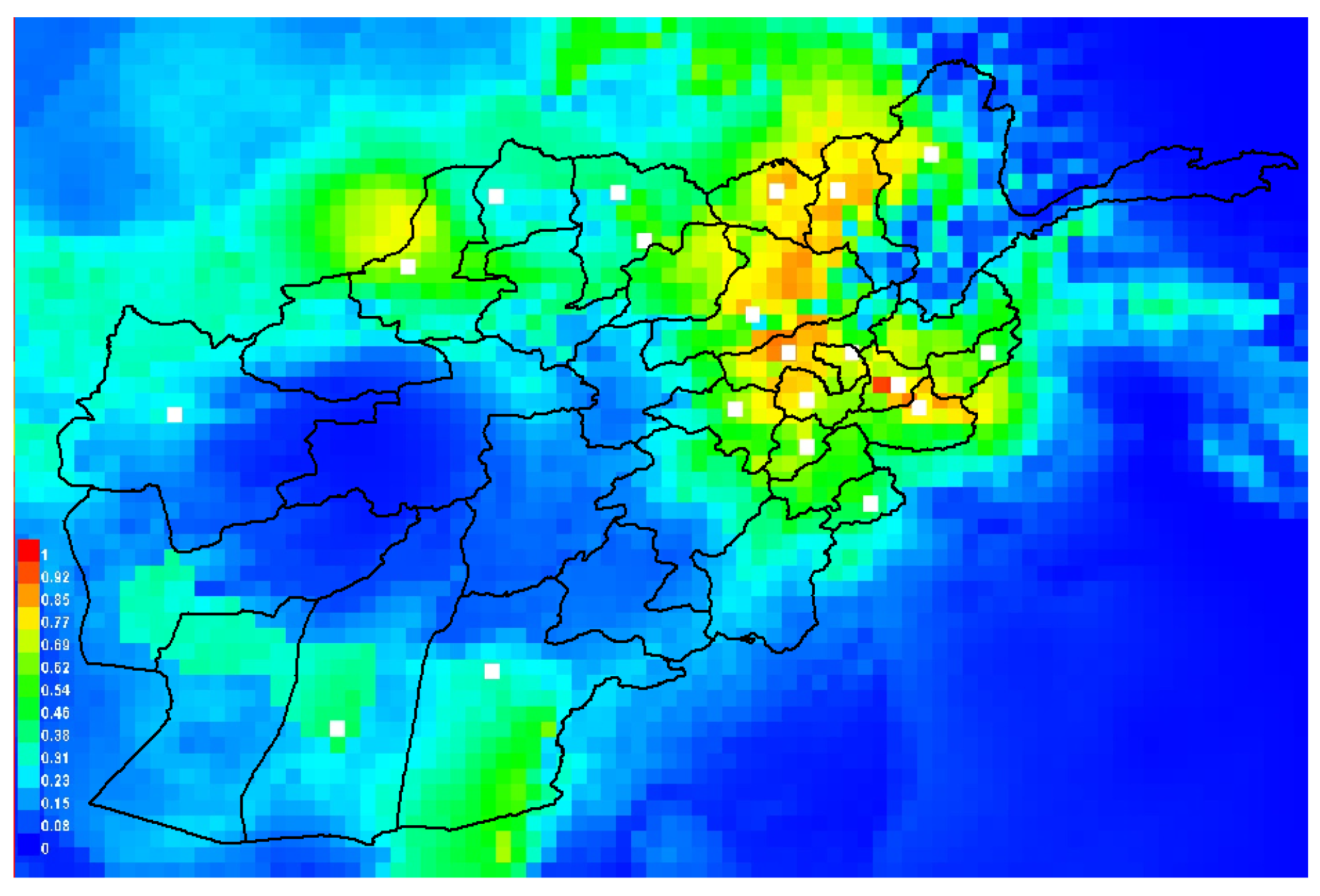 The ecological niche modelling of leishmaniasis in Afghanistan using MaxEnt: Predicted occurrence probability map of cutaneous leishmaniasis in Afghanistan bases on outbreak data with environmental variables in Table 2. Dots represent the administrative headquarters points used for the ENM. Warmer colors in the habitat suitability map show areas with better predicted conditions.
