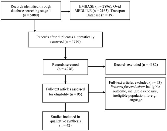 We performed the searches on 8 September 2016 via the database search interface OvidSP (http://ovidsp.ovid.com/). We searched the following databases for relevant studies: Embase (1996 to week 36, 2016), Ovid MEDLINE (R) (1996 to August 2016), and “Transport Database” (1988 to August 2016). We identified relevant studies by entering four sets of combined keywords in the “Multi-Field Search” option in OvidSP. We searched for the selected keyword combinations in “All Fields”. The keyword combinations were:
