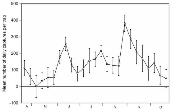 The estimated number of mosquitoes trapped daily varied over time, with three peaks observed in June, July and August (Figure 2). Overall, an estimated number of 299,408 mosquitoes was captured, with mean a daily capture rate per trap ranging from one mosquito in early May to 382 mosquitoes in late August.