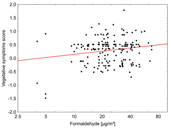 We found a weak but statistically significant correlation between the frequency of vegetative symptoms (dizziness, nausea, headaches) and the concentrations of formaldehyde. Such symptoms have been described in the literature also at relatively low levels of formaldehyde, even at or below 0.10 mg/m