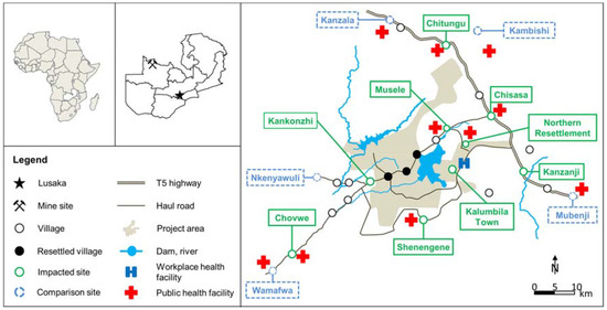 Solwezi district in the Northwestern Province of Zambia has traditionally been a rural, sparsely populated area [1]. However, recent mining developments (i.e., the Kansanshi and Lumwana copper mines) have accelerated in-migration and altered the socioeconomic profile of the district [2,3]. In 2009, the Trident project—a copper mine operated by First Quantum Minerals Limited (FQML)—was launched [4,5]. The mine, which became operational in 2015, is a green field development in a previously remote forested area, covering a lease area of approximately 950 km2. The development included construction of an open pit mine, processing plant, power lines, airstrip, maintenance and administrative infrastructure, access roads and a new residential settlement for the mine workforce and their families. The project development spurred socio-demographic and economic changes in the local community, including physical resettlement, influx of job- and opportunity-seeking migrants, shift in livelihood strategies and urbanization [6,7]. Hence, the direct and indirect ecological, social, economic and health impacts placed on the communities living in this area have been considerable [8,9].
