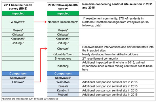 The full list of sentinel sites selected for the 2011 BHS and the 2015 follow-up is shown in Figure 2. In seven sentinel sites, data were collected in both the BHS and follow-up. For an additional seven sentinel sites, data were only available for 2015. This included two impacted sites: the newly developed Kalumbila Town (employee residential area) and Shenengene (a resettlement village). One impacted site was added due to increased importance (Kanzanji became the base of a major mining contractor) and four additional comparison sites were included to augment statistical power for comparison in future surveys. Importantly, findings from Wanyinwa (sampled during the 2011 BHS) are comparable to findings from Northern Resettlement (sampled during the 2015 follow-up) as 97% of the participating households in Northern Resettlement originated from Wanyinwa.