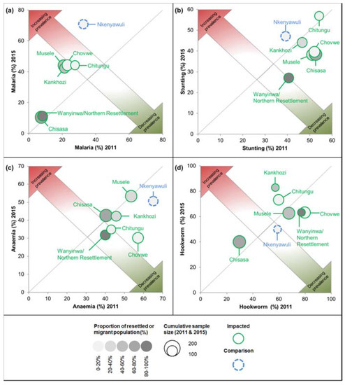Anaemia rates in impacted (41.0%) and comparison sites (49.4%) in 2015 were comparable to data obtained during the 2012 MIS for the Northwestern Province, where anaemia was reported in 45.5% in under-five-year-old children [23]. These high rates of anaemia will continue to have long-lasting negative consequences in the study area given that iron deficiency undermines growth, physical fitness and educational performance [30]. Malaria and stunting remained significant determinants for anaemia in multivariate regression models where resettled and migrant households were excluded, respectively (see supplementary Figure S2). This high anaemia rate is a concern, particularly if one considers that health facilities were present in 11 of the 14 sentinel sites (Figure 1) and that health facilities could be most efficient in combating anaemia through the provision of primary health care services, including antimalarial drugs, iron supplementations and growth monitoring [30,45].